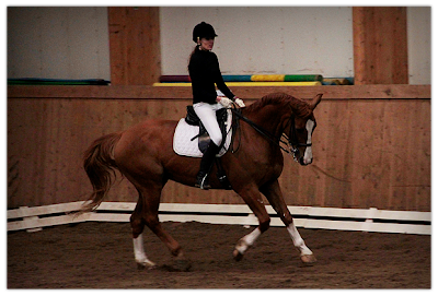 Eipä Nuutti siinä Henkan ja Helenan ratojen aikana kyllä kamalasti paremmaksi tullut... tein käynti-ravi-käynti siirtymisiä, jotta saisin hevosta herkemmäksi, mutta ainoa mitä sain aikaiseksi oli miljoona epäonnistunutta siirtymistä vasten kättä... Oli todella iloinen fiilis lähteä ratsastamaan sitä rataa läpi =) not. Eeva sanoi, että katsotaan nyt tuo rata ja mietitään sen jälkeen mitä pitäisi siinä korjata. Noh juu... kokonaisuus meni ihan ok. Ei iloisesti ok, vaan niinkuin... oooookoooo. Pituushalkaisija pysähdyksineen menee hyvin, muuten raviohjelmaan kaivataan huomenna paaaaaljon enemmän terävyyttä ja ilmaa alle ! Ravivoltit olivat ihan tyydyttävät, s-mallinen vaihtoura puolestaan pitää ratsastaa enemmän ulkoavuilla, jotta ehdin suoristamaan pituushalkaisijalla. Pohkeenväistöt ihan jees, jopa paremmat mitä odotin, mutta edelleen heppa saisi liikkua isommin sivulle. Keskiravit olivat ihan liian vaisut, mutta kun teimme niitä vielä tunnin loppuun niin alkoi löytyä sitä liitoa :) Ja yksi positiivinen juttu: se ei rikkonut laukalle kuin kerran (lävistäjällä taas) eikä sen jälkeen enää tuntunut lainkaan laukkaherkältä ! Peruutuskin onnistui kyllä ihan hyvin, hyvästä pysähdyksestä siihen on helppo lähteä :) Nuutti pysyi avuilla ja sain aikaiseksi tasan neljä hyvää askelta taaksepäin.